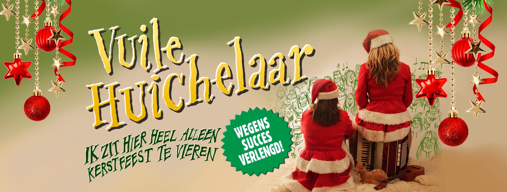 Eén ding is duidelijk, kom naar Vuile Huichelaar met: ‘Ik zit hier heel alleen Kerstfeest te vieren!’ Een vrolijk meezing-kerst-spektakel vol hilarische types en zalige, foute liedjes. Zing de kelen schor en lach de kerstballen uit je broek, want we hebben allemaal ons kruis te dragen. Maar als we dat samen doen, wordt het een stuk lichter!